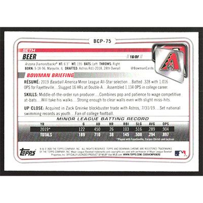 This is a 2020 Bowman Chrome Prospects Seth Beer baseball card. The card is #BCP-75 and pictures show condition.