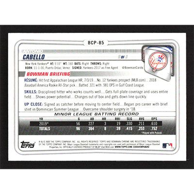 This is a 2020 Bowman Chrome Prospects Antonio Cabello baseball card. The card is #BCP-85 and pictures show condition.