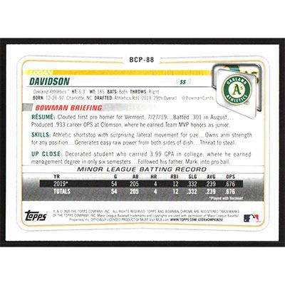 This is a 2020 Bowman Chrome Prospects Logan Davidson baseball card. The card is #BCP-88 and pictures show condition.