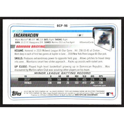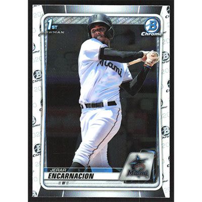 This is a 2020 Bowman Chrome Prospects Jerar Encarnacion baseball card. The card is #BCP-96 and pictures show condition.