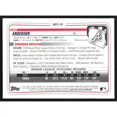 This is a 2020 Bowman Chrome Prospects Ian Anderson baseball card. The card is #BCP-97 and pictures show condition.