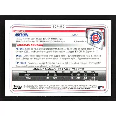 This is a 2020 Bowman Chrome Sapphire Prospects Aramis Ademan baseball card. The card is #BCP-110 and pictures show condition.