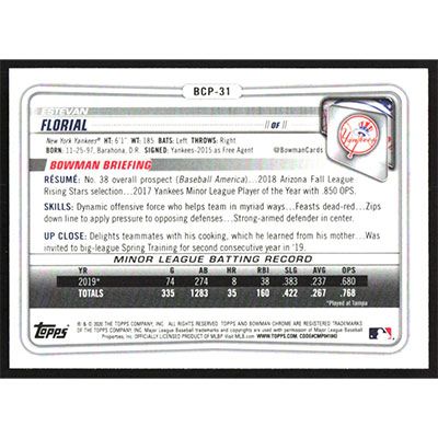 This is a 2020 Bowman Chrome Sapphire Prospects Estevan Florial baseball card. The card is #BCP-31 and pictures show condition.