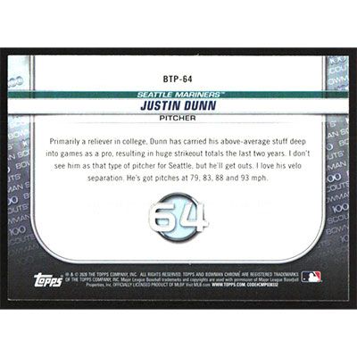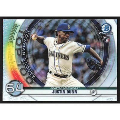 This is a 2020 Bowman Chrome Scouts Top 100 Justin Dunn baseball card. The card is #BTP-64 and pictures show condition. Team(s): Seattle Mariners Rookie Card (RC)
