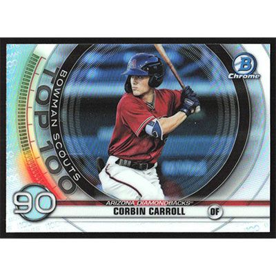 This is a 2020 Bowman Chrome Scouts Top 100 Corbin Carroll baseball card. The card is #BTP-90 and pictures show condition. Team(s): Arizona Diamondbacks