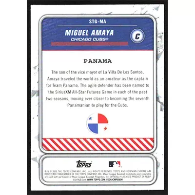 This is a 2020 Bowman Chrome Spanning the Globe Miguel Amaya baseball card. The card is #STG-MA and pictures show condition.