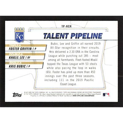 This is a 2020 Bowman Chrome Talent Pipeline Kris Bubic, Foster Griffin and Khalil Lee baseball card. The card is #TP-KCR and pictures show condition. Team(s): Kansas City Royals