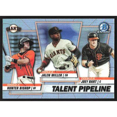 This is a 2020 Bowman Chrome Talent Pipeline Hunter Bishop, Joey Bart and Jalen Miller baseball card. The card is #TP-SFG and pictures show condition. Team(s): San Francisco Giants
