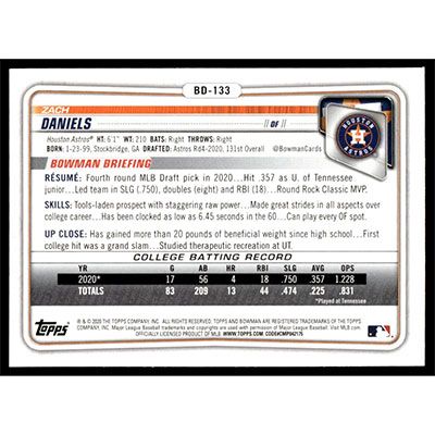 This is a 2020 Bowman Draft Zach Daniels baseball card. The card is #BD-133 and pictures show condition.