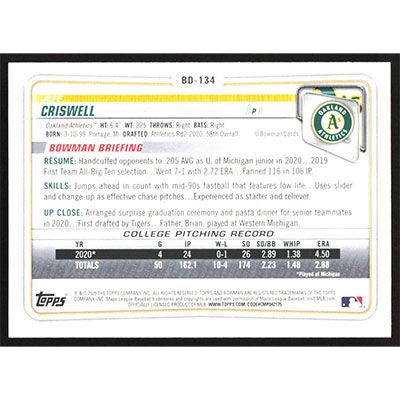 This is a 2020 Bowman Draft Jeff Criswell baseball card. The card is #BD-134 and pictures show condition.