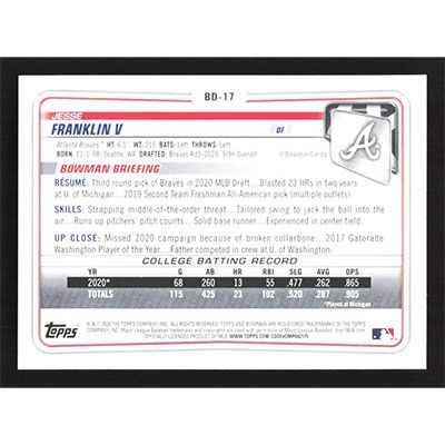 This is a 2020 Bowman Draft Jesse Franklin V baseball card. The card is #BD-17 and pictures show condition.