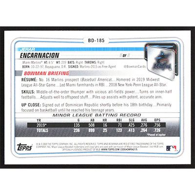 This is a 2020 Bowman Draft Jerar Encarnacion baseball card. The card is #BD-185 and pictures show condition.