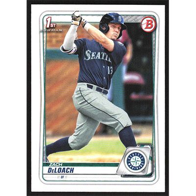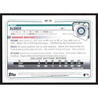 This is a 2020 Bowman Draft Zach DeLoach baseball card. The card is #BD-28 and pictures show condition.