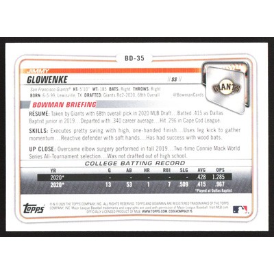 This is a 2020 Bowman Draft Jimmy Glowenke baseball card. The card is #BD-35 and pictures show condition.