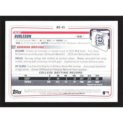 This is a 2020 Bowman Draft Alec Burleson baseball card. The card is #BD-45 and pictures show condition.