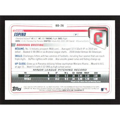 This is a 2020 Bowman Draft Purple Daniel Espino baseball card. The card is #BD-26 and pictures show condition. This card is limited; #'d 238/250. Team(s): Cleveland Indians
