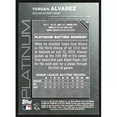 This is a 2020 Bowman Platinum Yordan Alvarez baseball card. The card is #100 and pictures show condition.