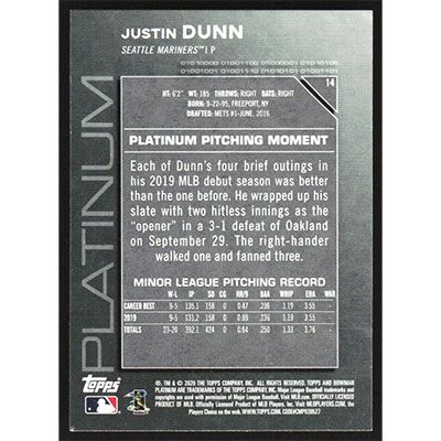 This is a 2020 Bowman Platinum Justin Dunn baseball card. The card is #14 and pictures show condition.