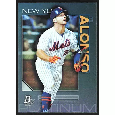This is a 2020 Bowman Platinum Pete Alonso baseball card. The card is #49 and pictures show condition.