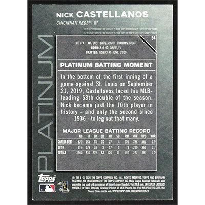 This is a 2020 Bowman Platinum Nick Castellanos baseball card. The card is #54 and pictures show condition.