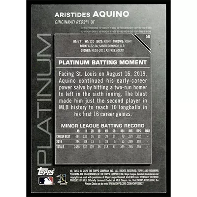 This is a 2020 Bowman Platinum Aristides Aquino baseball card. The card is #59 and pictures show condition.