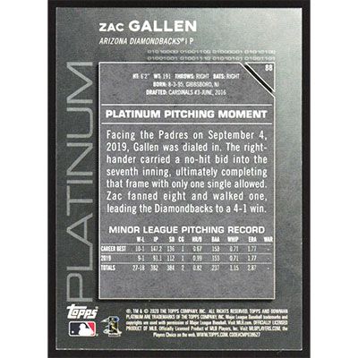 This is a 2020 Bowman Platinum Zac Gallen baseball card. The card is #88 and pictures show condition. Team(s): Arizona Diamondbacks Rookie Card (RC)