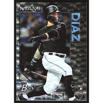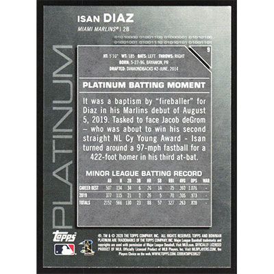 This is a 2020 Bowman Platinum Ice Isan Diaz baseball card. The card is #9 and pictures show condition.