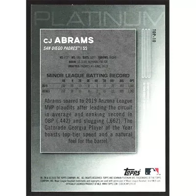 This is a 2020 Bowman Platinum Top Prospects CJ Abrams baseball card. The card is #TOP-10 and pictures show condition.