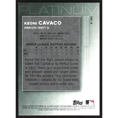This is a 2020 Bowman Platinum Top Prospects Keoni Cavaco baseball card. The card is #TOP-19 and pictures show condition.