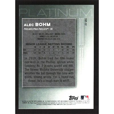 This is a 2020 Bowman Platinum Top Prospects Alec Bohm baseball card. The card is #TOP-32 and pictures show condition.