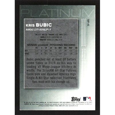 This is a 2020 Bowman Platinum Top Prospects Kris Bubic baseball card. The card is #TOP-43 and pictures show condition.