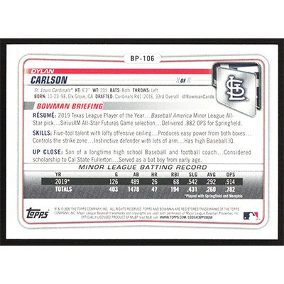 This is a 2020 Bowman Prospects Dylan Carlson baseball card. The card is #BP-106 and pictures show condition.