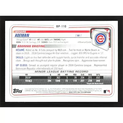 This is a 2020 Bowman Prospects Aramis Ademan baseball card. The card is #BP-110 and pictures show condition.