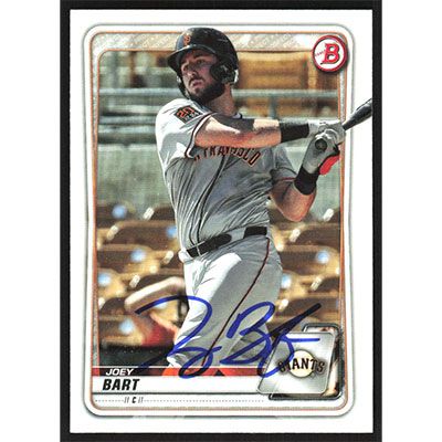 This is a 2020 Bowman Prospects Joey Bart autographed baseball card. This card has been signed, in blue, by Joey Bart, and is guaranteed authentic by Ballcardz.com. The card is #BP-112 and pictures show condition.