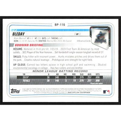 This is a 2020 Bowman Prospects J.J. Bleday baseball card. The card is #BP-116 and pictures show condition.