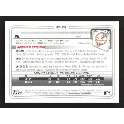 This is a 2020 Bowman Prospects Luis Gil baseball card. The card is #BP-132 and pictures show condition.