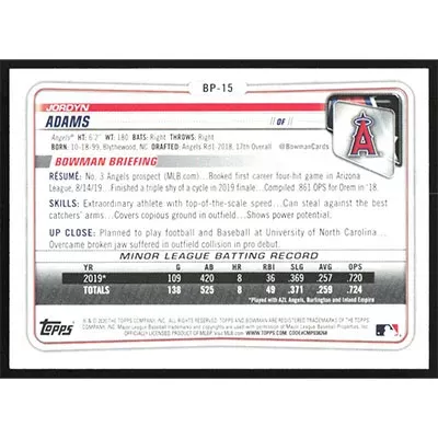 This is a 2020 Bowman Prospects Jordyn Adams baseball card. The card is #BP-15 and pictures show condition.