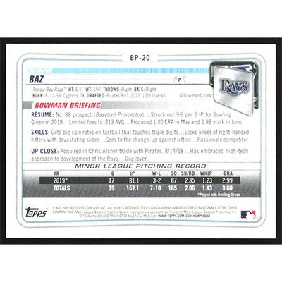 This is a 2020 Bowman Prospects Shane Baz baseball card. The card is #BP-20 and pictures show condition.
