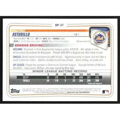 This is a 2020 Bowman Prospects Wilfred Astudillo baseball card. The card is #BP-37 and pictures show condition.