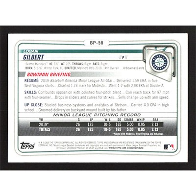 This is a 2020 Bowman Prospects Logan Gilbert baseball card. The card is #BP-58 and pictures show condition.