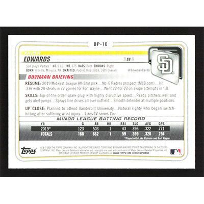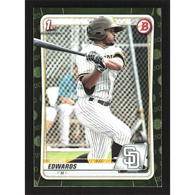 This is a 2020 Bowman Prospects Camo Xavier Edwards baseball card. The card is #BP-10 and pictures show condition.