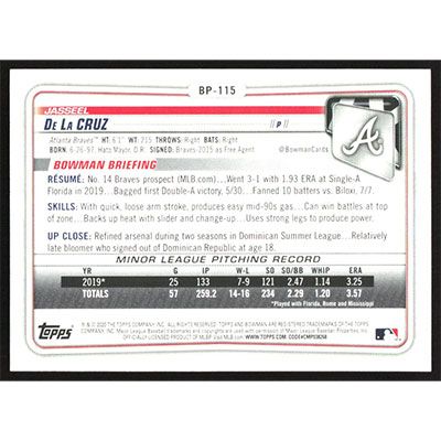 This is a 2020 Bowman Prospects Camo Jasseel De La Cruz baseball card. The card is #BP-115 and pictures show condition.