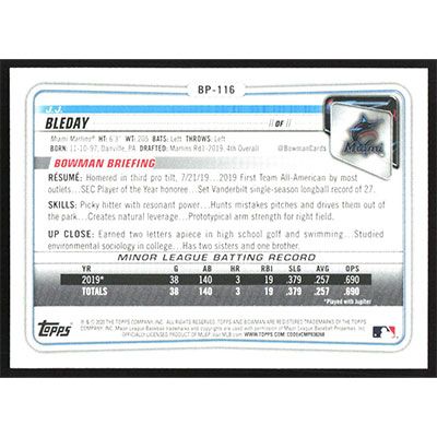 This is a 2020 Bowman Prospects Camo J.J. Bleday baseball card. The card is #BP-116 and pictures show condition.