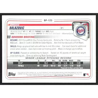 This is a 2020 Bowman Prospects Camo Jordan Balazovic baseball card. The card is #BP-123 and pictures show condition.