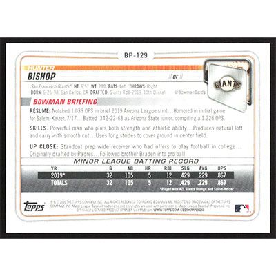 This is a 2020 Bowman Prospects Camo Hunter Bishop baseball card. The card is #BP-129 and pictures show condition.