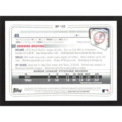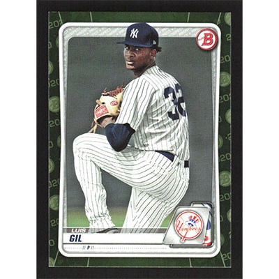 This is a 2020 Bowman Prospects Camo Luis Gil baseball card. The card is #BP-132 and pictures show condition.