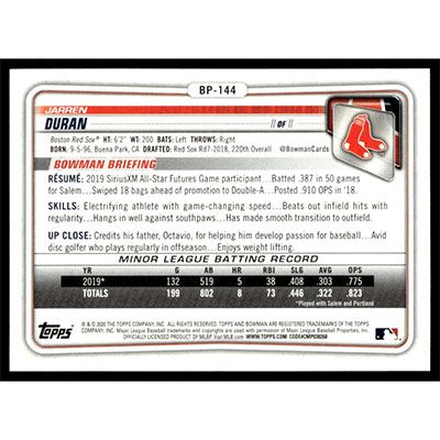 This is a 2020 Bowman Prospects Camo Jarren Duran baseball card. The card is #BP-144 and pictures show condition.