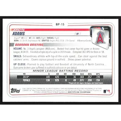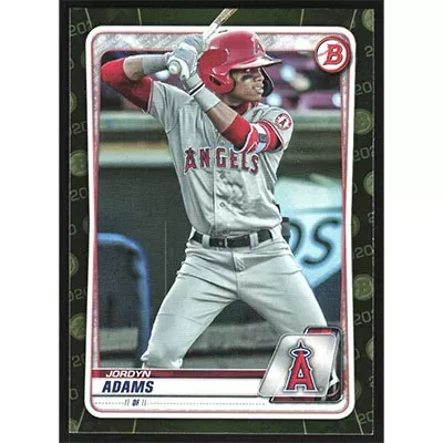 This is a 2020 Bowman Prospects Camo Jordyn Adams baseball card. The card is #BP-15 and pictures show condition.