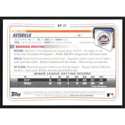 This is a 2020 Bowman Prospects Camo Wilfred Astudillo baseball card. The card is #BP-37 and pictures show condition.