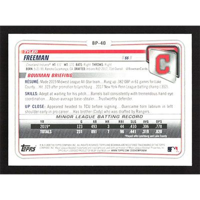 This is a 2020 Bowman Prospects Camo Tyler Freeman baseball card. The card is #BP-40 and pictures show condition.